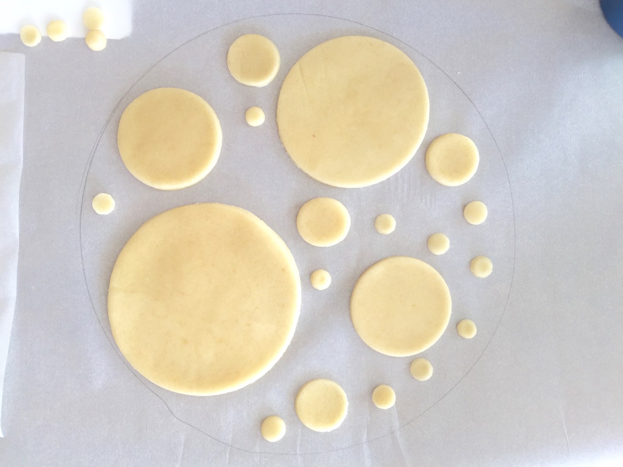 I rolled out the marzipan, which is an almond paste people use to make shapes and decorative elements on cakes. You’ll find a generous slab of it inside a Christmas stollen. Once I rolled it out I looked around for anything that could help me cut out different sized circles — a one-cup measuring cup, the lid to food coloring gel and another lid to the sprinkles jar. I then used food coloring to paint the circles. My tip is to go light and then layer it on — if you paint too much it takes forever to dry. I had to dab the blue to pull a bit of the color off because it insisted on staying damp. I’d also recommend making and coloring the shapes ahead of time (you can store them wrapped in the fridge). It ended up being the most time-consuming part of the whole process, at least for me.