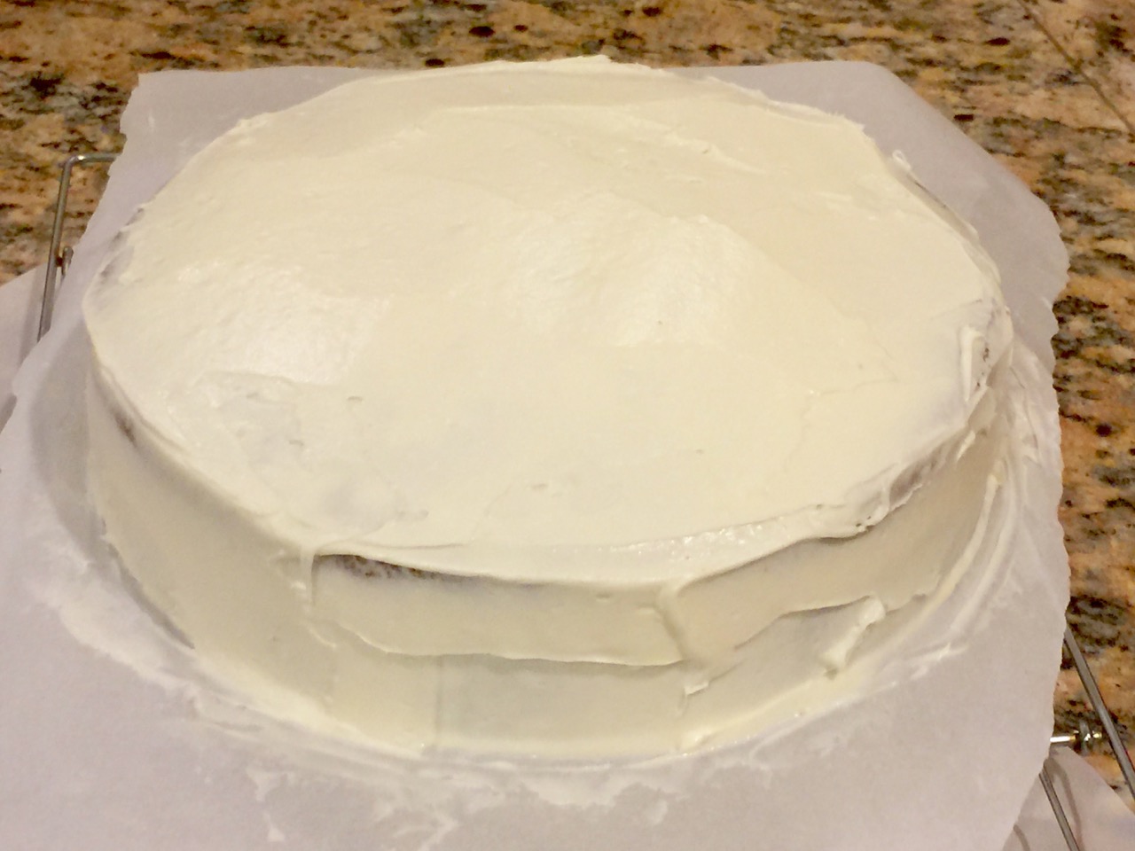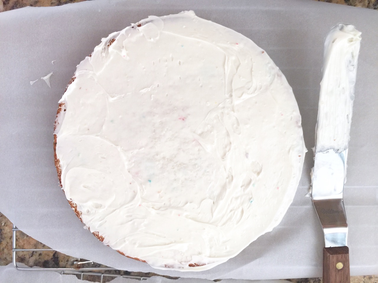 Once that was done I frosted the top of one of the cakes, then put the other one cut-side down on top of it. This gave me a clean edge around the top and sides of the cake.