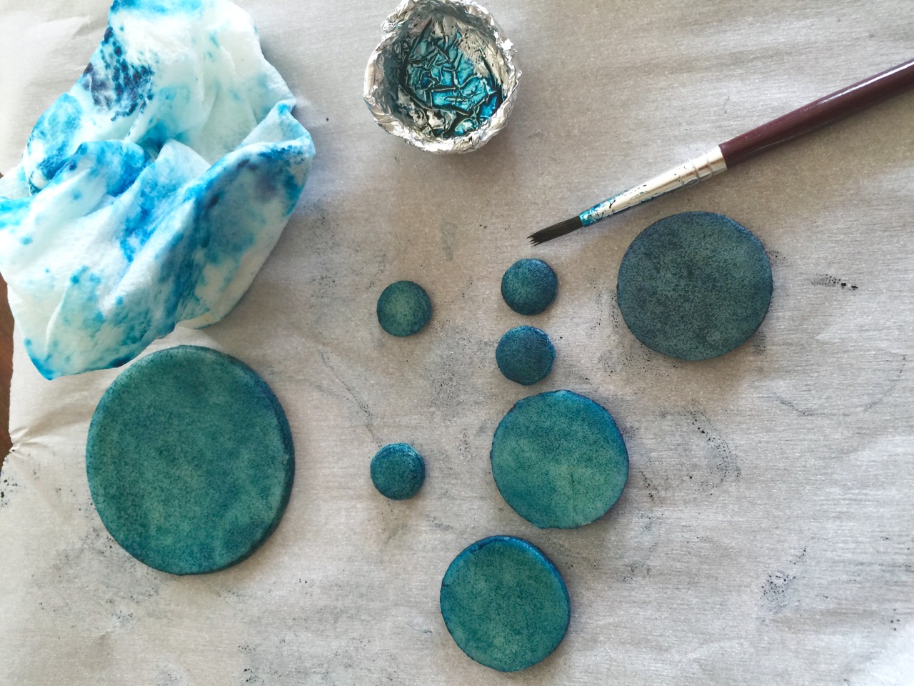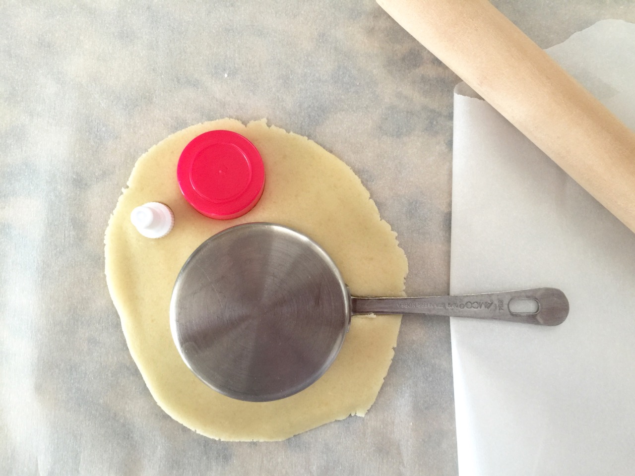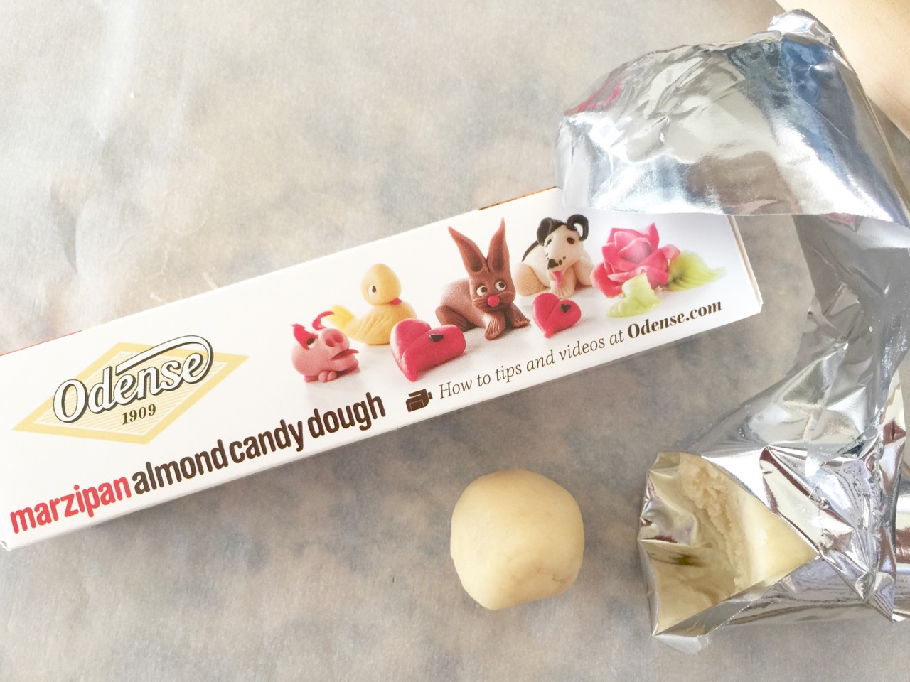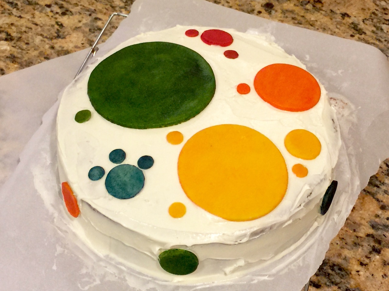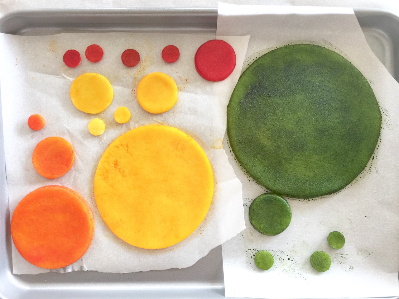I rolled out the marzipan, which is an almond paste people use to make shapes and decorative elements on cakes. You’ll find a generous slab of it inside a Christmas stollen. Once I rolled it out I looked around for anything that could help me cut out different sized circles — a one-cup measuring cup, the lid to food coloring gel and another lid to the sprinkles jar. I then used food coloring to paint the circles. My tip is to go light and then layer it on — if you paint too much it takes forever to dry. I had to dab the blue to pull a bit of the color off because it insisted on staying damp. I’d also recommend making and coloring the shapes ahead of time (you can store them wrapped in the fridge). It ended up being the most time-consuming part of the whole process, at least for me.