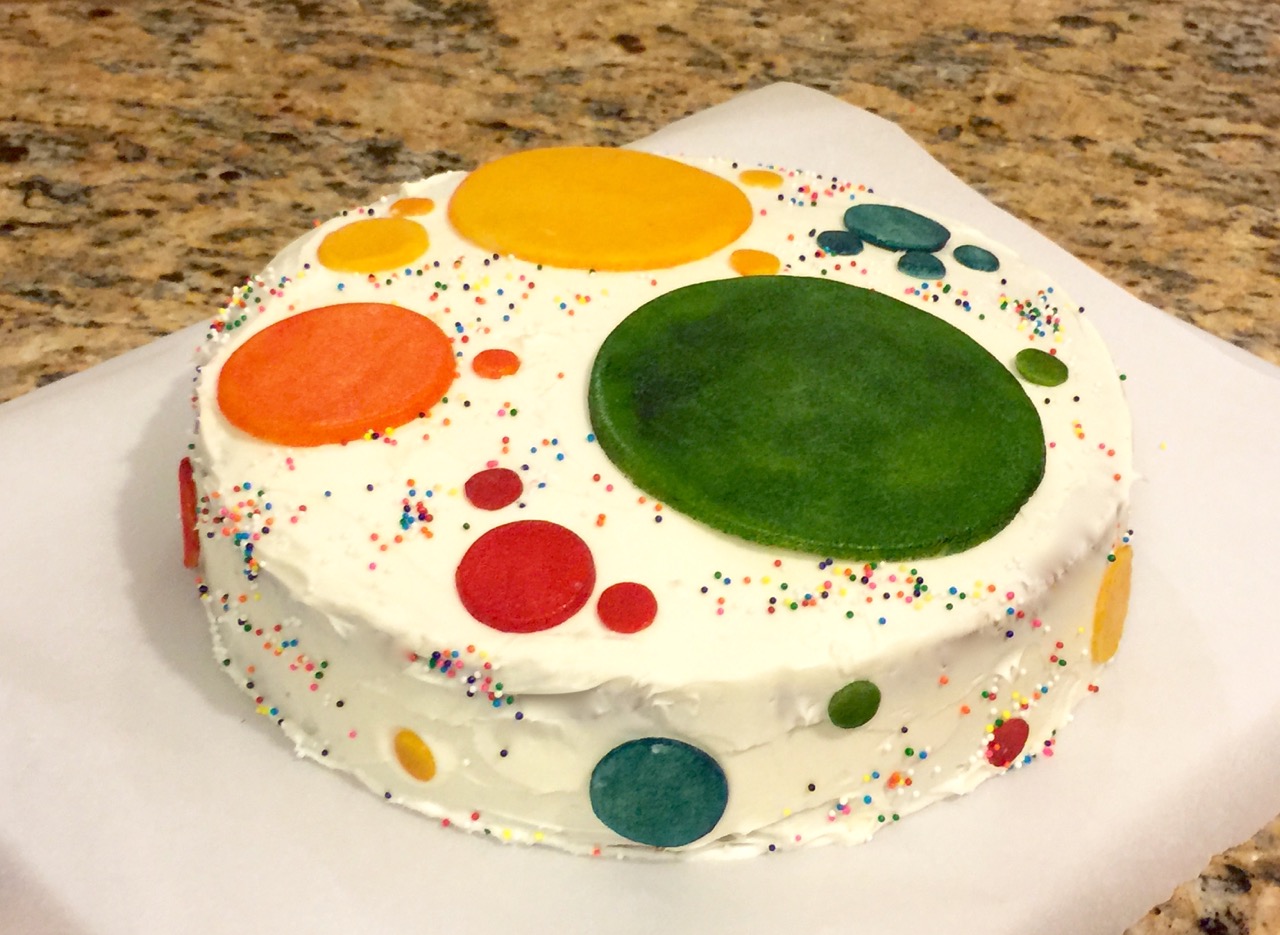 I then went ahead and frosted the whole thing. It was now much later in the day than I had planned because those agar.io cells took longer to paint and dry. I had outlined one of the cake pans on a sheet of parchment and practiced where I’d place the shapes so I wouldn’t make a mistake when it was time to do it for real. I’m pretty sure some food coloring would have stained the frosting if I tried to make the shapes around after the fact. Pre-planning the placement made it easy when the time came, and then I liberally tossed small colored sprinkles to represent the smallest, totally-don’t-have-a chance cells that would pretty much be eaten up in a single gulp in the game (and, once this cake was served, in life).