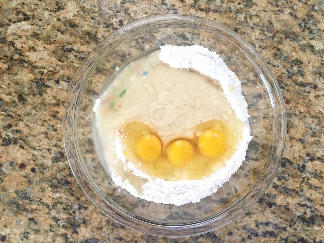 Most boxed cake mixes already have pudding in it, so all I needed to do was add my starter. Because I was adding extra liquid (and flour and sugar) to the mix, I reduced the water from 1 cup to ½ cup, and reduced the oil from ½ cup to ⅓ cup. I was using whole eggs, so I knew it would bind together well enough.