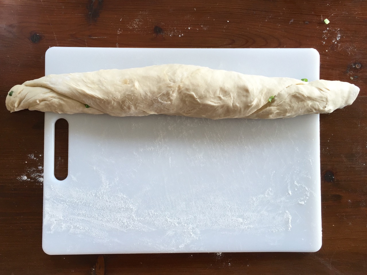 While it’s rising, chop up your scallions or green onions, being sure to include the white part (discard the very end where the roots are).