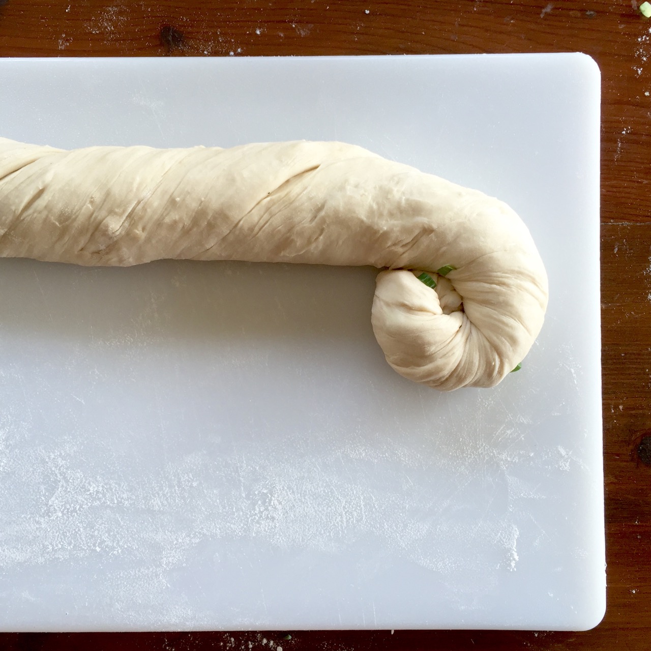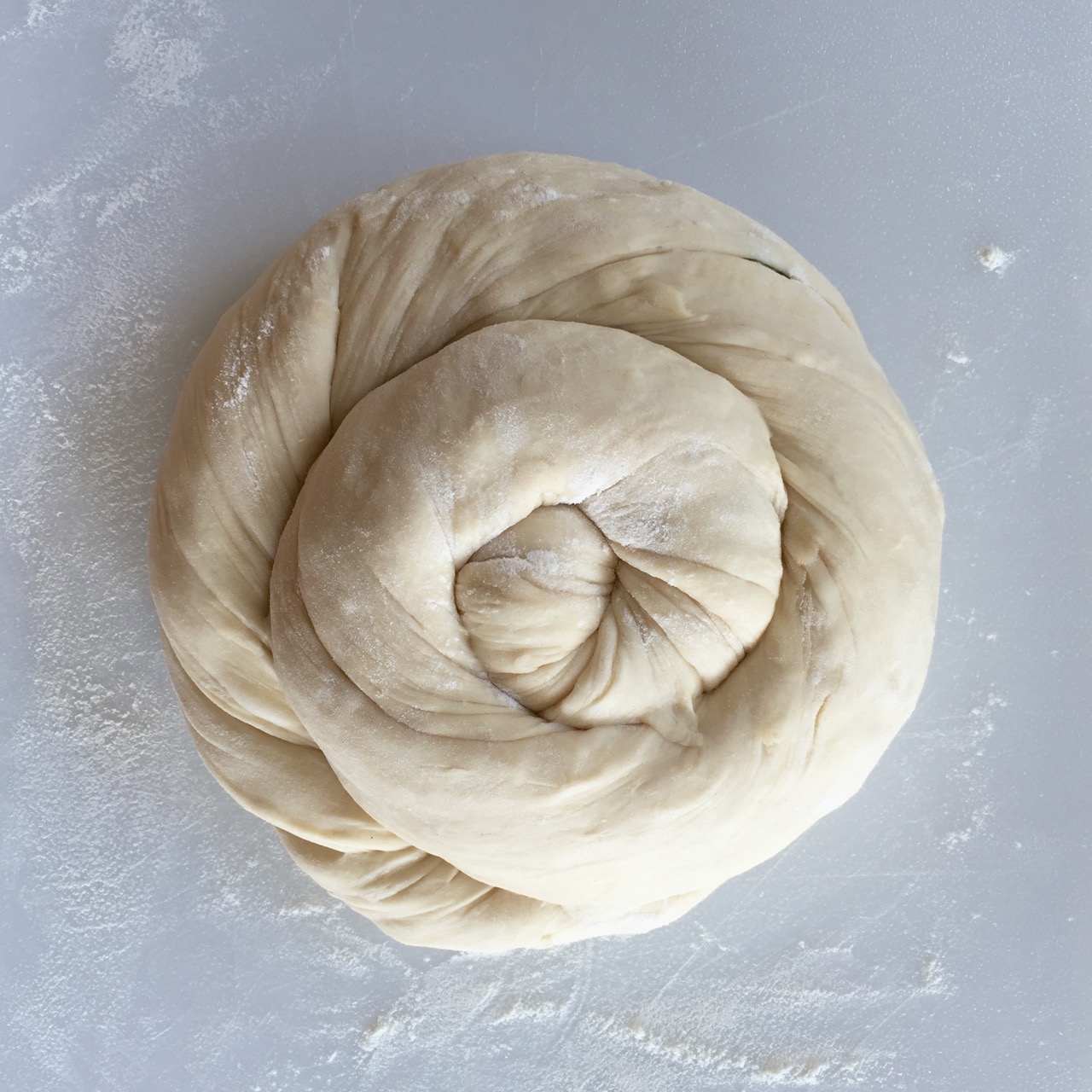 - From the bottom, begin to roll the dough into a long log. Then twist the log into a spiral.